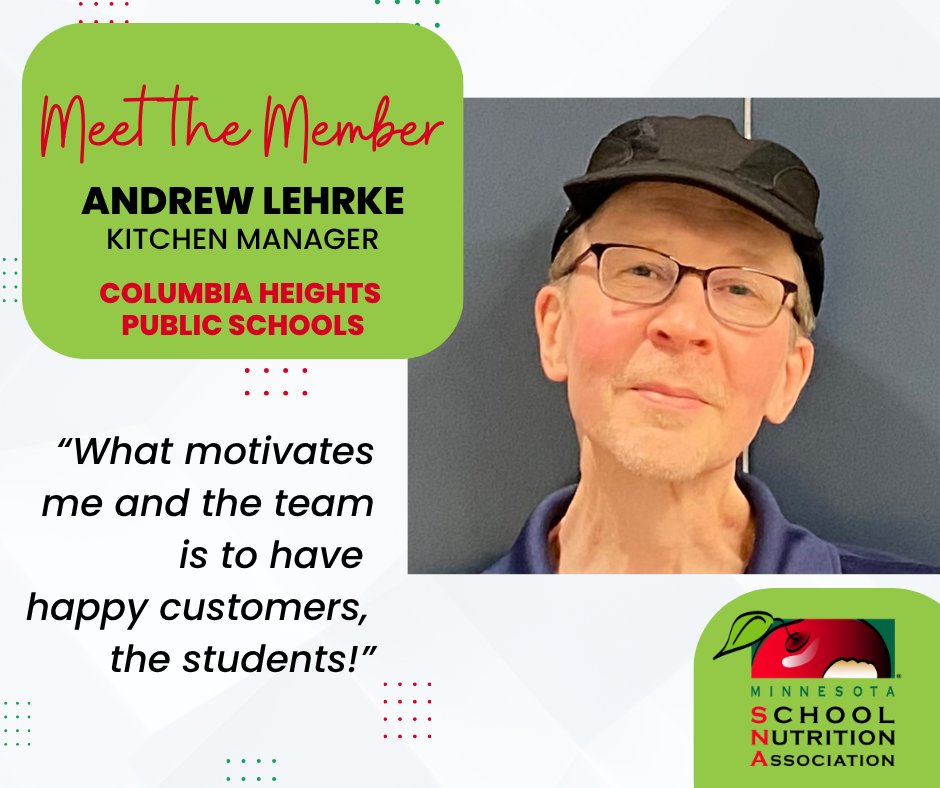 Member SpotlightMeet Andrew Lehrke, Kitchen Manager at Columbia Heights Public Schools. To read past member spotlights, click here. Nominate a Colleague You Admire! Help recognize the hard work of our colleagues in the school nutrition profession who go above and beyond. The MSNA and SNA Awards programs highlight the outstanding and important work of our members and state affiliates. Members and state associations are eligible for a variety of honors that recognize their achievements in school foodservice, leadership, membership recruitment and professional development. Nominations for 2027 will open early 2027.