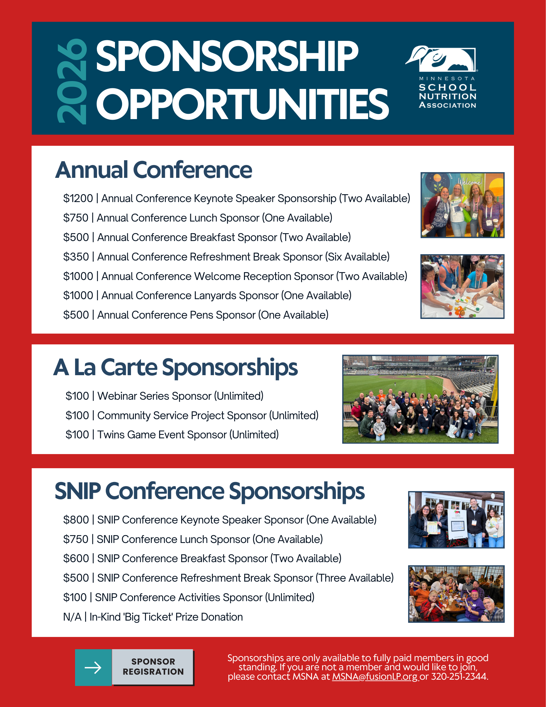 2026 Sponsorship OpportunitiesSponsorships are available to paid industry members and support aspects of our conferences and community events. Sponsorships present unique opportunities for your business to gain a competitive edge and play a crucial role in convening professionals for valuable information-sharing, creating meaningful opportunities to position MSNA members (including you!) for success. .